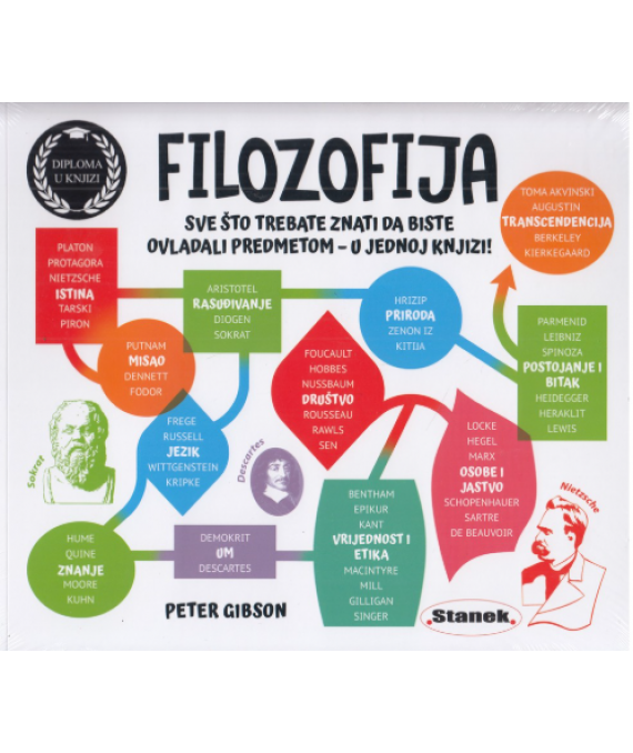 Filozofija je vrlo zabavan predmet. Ona postavlja teška pitanja pa se u početku čini da je nemoguće odgovoriti na neka od njih. No kad naučite metode analiziranja problema, pronalazite zadovoljstvo u uzbuđenju traganja za odgovorima. Jedna ideja vodi prema drugoj, a zatim slijede uzbudljivi trenuci otkrića. Osim što pruža izazov rješavanja zagonetki, filozofija dodiruje sva područja koja su zaista važna. Većinu studenata fasciniraju jedno ili dva specifična područja, no od ključne je važnosti zadržati širu sliku, a upravo to nudi ova knjiga. Knjiga Diploma u jednoj knjizi: Filozofija pruža vam sveobuhvatan prikaz filozofije u jednom svesku. Ona obuhvaća sve važne teme zapadne filozofije, uz blagi naglasak na tradiciju anglosaksonskih zemalja kad je riječ o misliocima iz modernih vremena. Fascinantna je povijest filozofije prikazana u posebnom odjeljku na kraju svakog poglavlja i opisuje postupnu pojavu novih područja razmišljanja te ljude koji su oblikovali disciplinu. Ti odjeljci uključuju i kratke prikaze svih slavnih osoba iz tog područja, premda je izbor novijih mislilaca nužno selektivniji. Svako je područje usredotočeno na jednu temu. Knjiga započinje općenitim i teoretskim temama, pa prelazi na istraživanje pitanja koja se bave ljudskim bićima i njihovim ponašanjem te završava pogledom na prirodu i transcendenciju. Poglavlja se mogu čitati bilo kojim redoslijedom, a svaki je odjeljak unutar poglavlja moguće čitati zasebno. Prilikom predstavljanja pojedine teme, najprije se objašnjava temeljni problem i njegove implikacije, a potom se ističu različite vrste argumenata. Njih valja shvatiti kao temelj za raspravu, a ne kao sveobuhvatnu sliku. Želite li napredovati u filozofiju, kao i u većini drugih područja, postoji terminologija koju valja svladati, a najvažniji su pojmovi uključeni u tekst. Tamo gdje je to važno objašnjeni su stručni izrazi, a njih je moguće pronaći i u pojmovniku na kraju knjige.